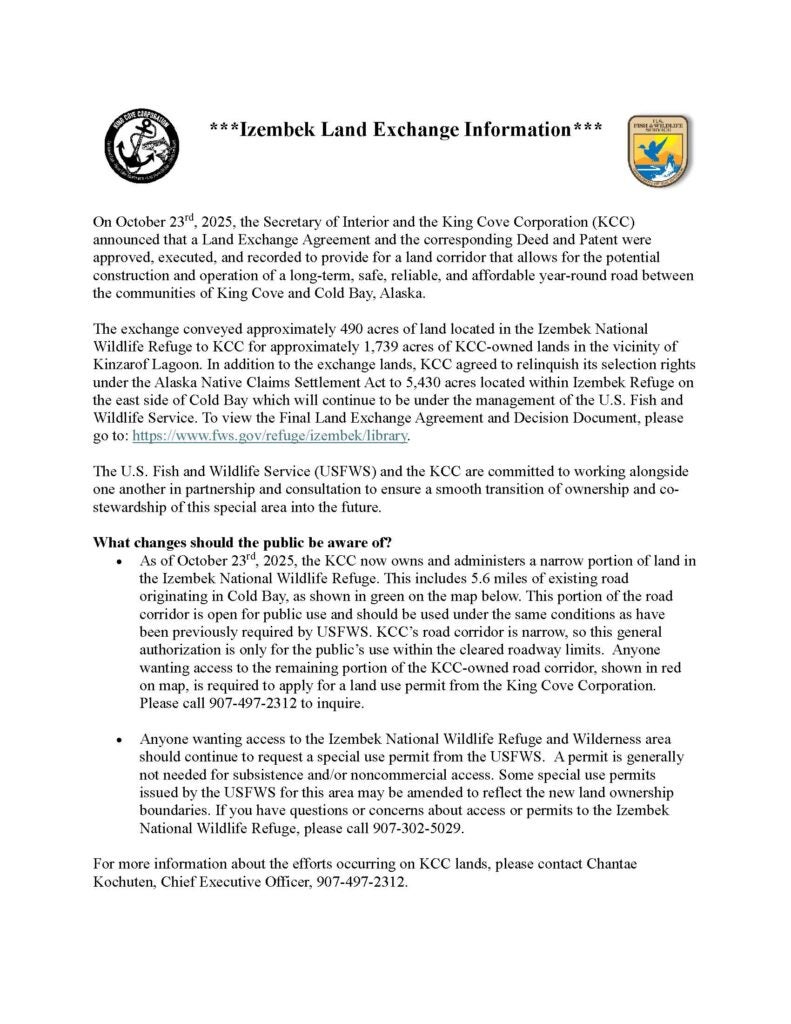 To view the Final Land Exchange Agreement and Decision Document, please go to: https://www.fws.gov/refuge/izembek/library